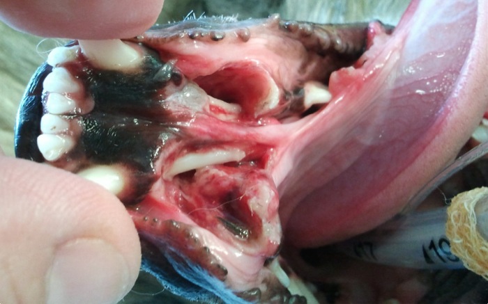 Del fragmento distal sobresalen los alveolos dentales limpiamente separados de las raíces de ambos caninos inferiores.