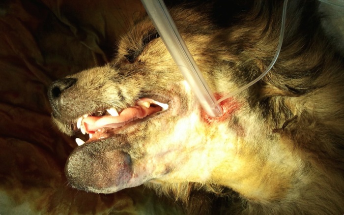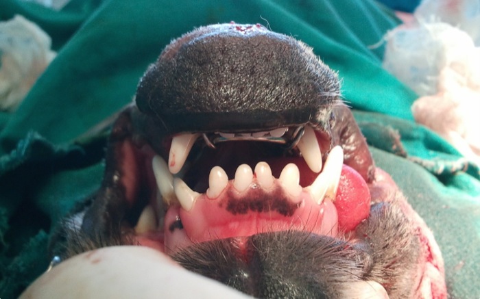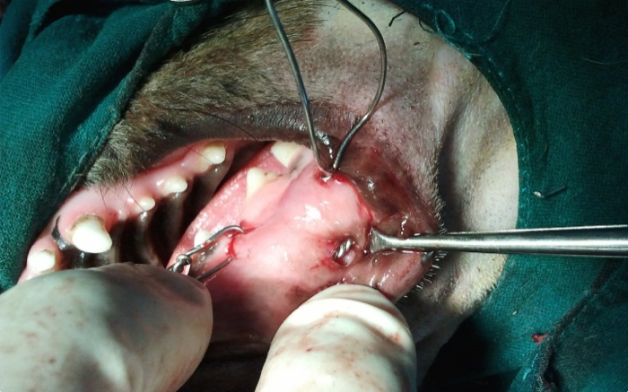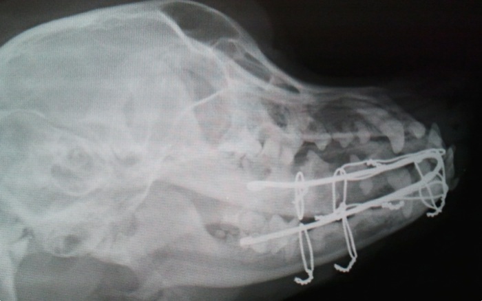 La aguja de Kirshner una vez queda en su forma y posición definitiva se sujeta con alambre de 0,8 mm primeramente en rostral cruzando sobre ambos caninos. El cierre se hace bajo el mentón como en la típica fractura de sínfisis que tanto vemos en el gáto paracaidista.