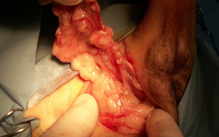 Posicionado el paciente de cúbito prono y con la cola replegada cranealmente se sutura el ano y posteriormente se incide en lateral a éste sobre la hernia y desde la base del rabo a isquion. La debilidad muscular del diafragma pélvico ha generado una dilatación y flexura de la ampolla rectal donde se retienen heces que cada vez cuesta más evacuar. En otros casos evoluciona hacia la saculización y aparición de divertículos en recto. La debilidad muscular ha dejado paso a la grasa abdominal que se ha ido fibrosando y adhiriendo en esta zona.