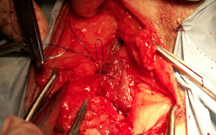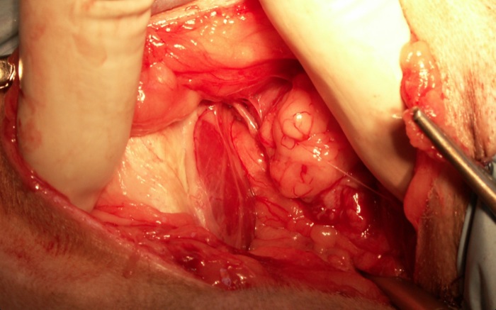 | Tratamiento | Cierre del triángulo muscular perineal con elevación del músculo obturador interno. La sutura muscular en este caso será suficiente para asegurar una reparación fuerte del área perineal. A continuación se castra ya que los trastornos endocrinos por hormonas sexuales en el macho son una causa de esta hernia junto con el deterioro neurológico por estreñimiento crónico, la atrofia muscular senil y la patología prostática. |