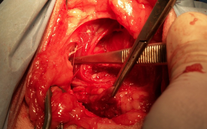 Tras desperiostizar el obturador interno del arco isquiático lo elevamos y valoramos definitivamente si la musculatura será suficiente para un cierre seguro. En esta imagen dirigimos medialmente el elevador del ano y coccigeo y dorsalmente el obturador teniendo cuidando las estructuras vasculares y nerviosas como vasos pudendos, nervio perineal y más medial el pudendo y lateralmente el nervio ciático.
