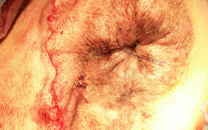 En caso de duda, antes del cierre definitivo, un ayudante no estéril puede realizar una palpación rectal para identificar cualquier posible debilidad en el cierre. Hay que retirar en ocasiones piel distendida sobre todo en casos crónicos. El uso de sutura intradérmica en este área evita picores y contaminaciones al no tener ninguna estructura que pueda retener restos de ningún tipo. La orquidectomía eliminará la acción de los andrógenos responsables en un tercio de recidivas y lesiones contralaterales. En principio yo no utilizo laxantes de ningún tipo tras la cirugía. La misma dieta previa se continúa algunas semanas para favorecer el vaciado e impedir dehiscencias de los múltiples puntos sobre las distintas estructuras.