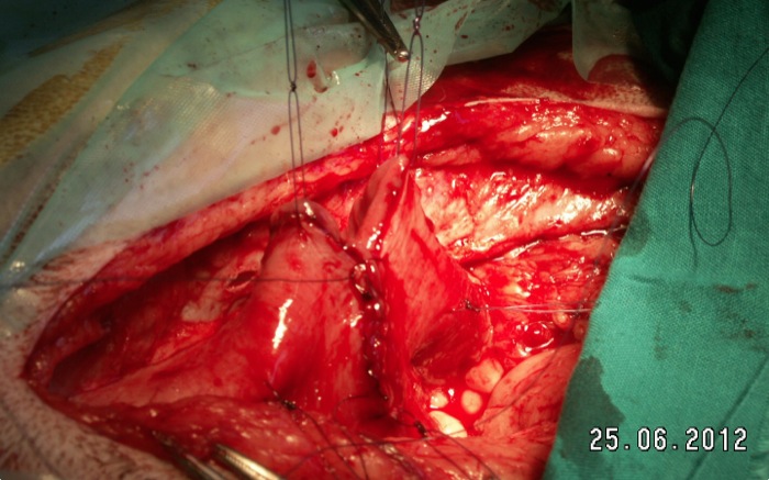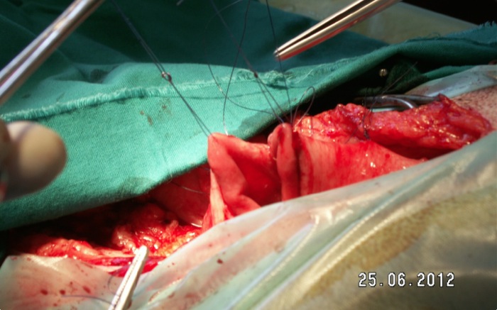 Después de una limpieza exhaustiva se cierra mucosa, muscular y serosa en una primera linea de sutura para reinvertir posteriormente y luego omentalizar, en este caso con omento mayor.