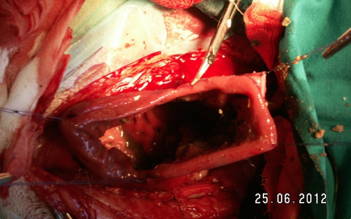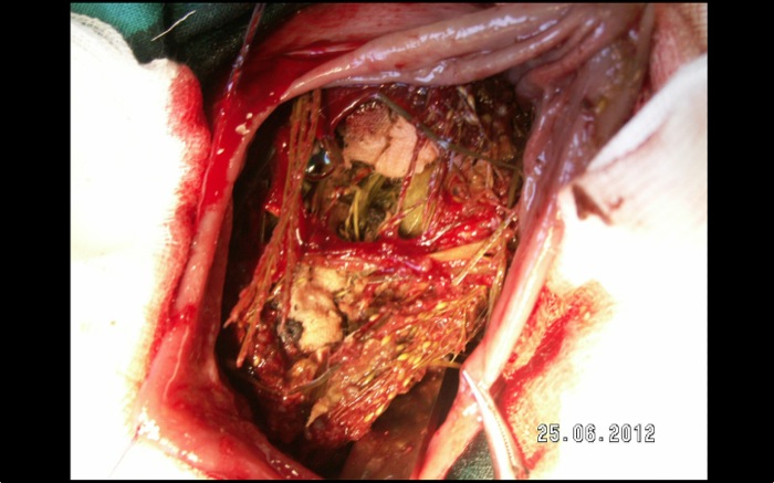 Esta imagen se obtiene tras retirar bastante contenido. Ante un contenido de este tipo con infinidad de componentes, algunos de pequeño tamaño, que además se disgregan al intentar extraerse ha de realizarse una sujeción que mantenga hermética la entrada a cavidad abdominal.