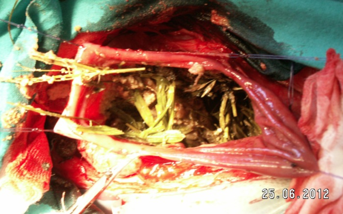 Nada más abrir nos encontramos con hierba y gasas probablemente de alguna ingestión inadvertida durante la hospitalización en otro centro para ser tratada de gastroenteritis. Las múltiples suturas para manejar el estómago una vez abierto no serán suficientes en este caso para garantizar una extracción limpia que no contamine.
