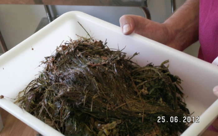 Unas cuantas gasas sin mayor importancia y una cantidad extrema de hierba hubieran comprometido la vida de la paciente. En este caso la ausencia de motilidad tras la gastroenteritis inicial debió desencadenar una ingesta sin límite de algo que en otras ocasiones consideramos como beneficioso. No hubo una anestesia complicada y al finalizar el lavado peritoneal ya se empezaba a ver motilidad intestinal y en estómago. Hubo una recuperación total rápida en parte por no esperar, lo que hubiese comprometido tanto el momento quirúrgico como la buena evolución.