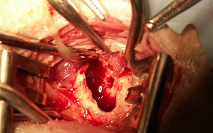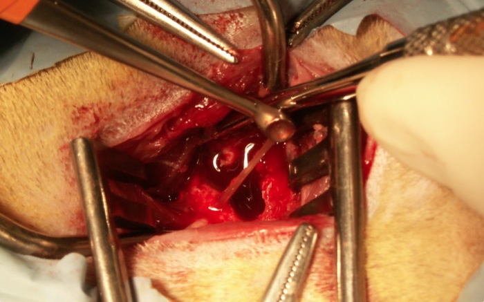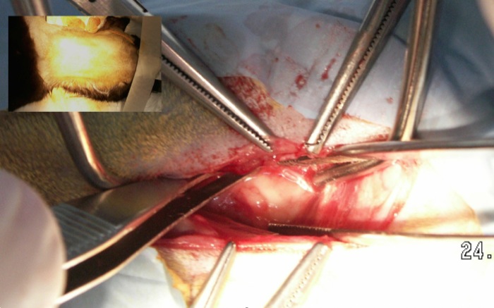 En posición de cubito supino con una toalla bajo el cuello podemos palpar fácilmente la bulla (a diferencia del perro) y a partir de aquí con cierta presión sobre la bulla se va desplazando el tejido en lateral y medial. La incisión en piel nos deja sobre el tejido blanco óseo de la porción ventromedial de la bulla teniendo en cuenta la vena linguofacial que se retrae.