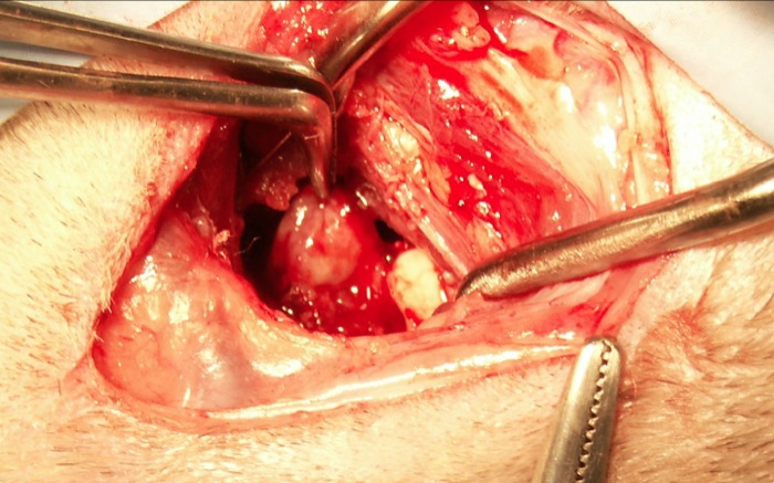 | Tratamiento | Osteotomía de la bulla mediante abordaje ventral y retirada de contenido mucoso denso que ocupa toda la cavidad y retirada del epitelio que la recubre internamente. |