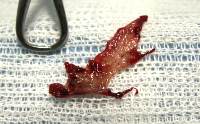 Se comprueba la ausencia de pólipos y finalmente se retira el epitelio que en este caso sale casi de una pieza. En caso de no extraerlo todo tendríamos de nuevo sintomatología de oído medio o fístulas. Sólo nos queda lavar abundantemente con suero tibio y cierre por planos.