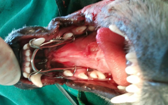 La aguja de Kirshner una vez queda en su forma y posición definitiva se sujeta con alambre de 0,8 mm primeramente en rostral cruzando sobre ambos caninos. El cierre se hace bajo el mentón como en la típica fractura de sínfisis que tanto vemos en el gáto paracaidista.