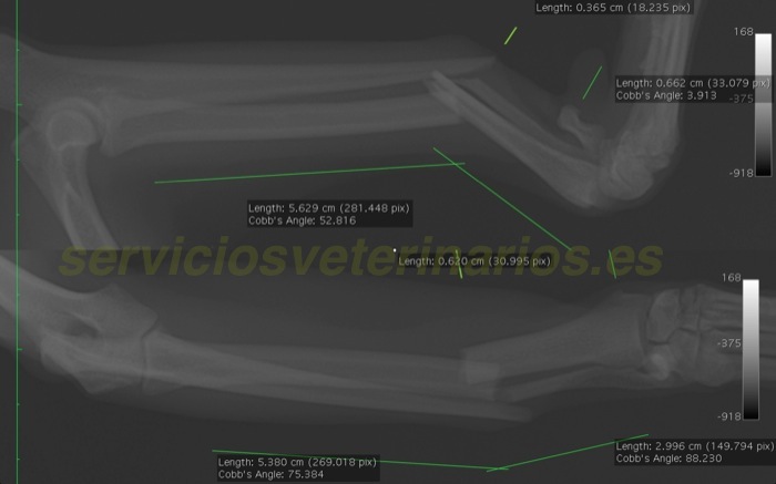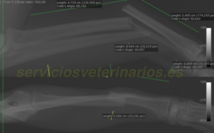Esta radiografía del miembro derecho también nos presenta una fractura limpia. Como siempre antes de entrar en quirófano se tienen tomadas un amplio número de distancias y diámetros óseos que nos ayuda a elegir mejor el material a implantar durante la cirugía así como acortar el tiempo quirúrgico.