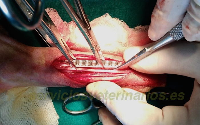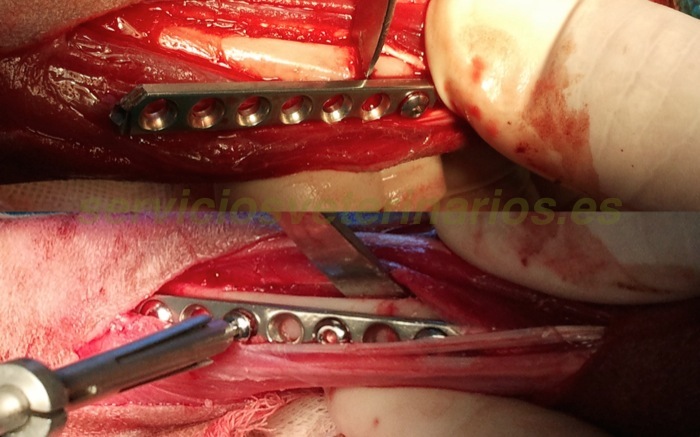 En el miembro derecho se puede reducir más fácilmente el foco de fractura, no ha costado tanto enfrentar de nuevo los fragmentos y se puede colocar la placa primero y todos los tornillos después. Por supuesto esta opción (presentar primero la placa) no requiere calcular tan cuidadosamente la posición de los primeros tornillos que de no ser perfecta condicionaría una incorrecta alineación de la fractura.