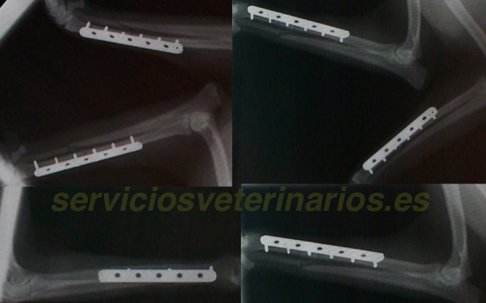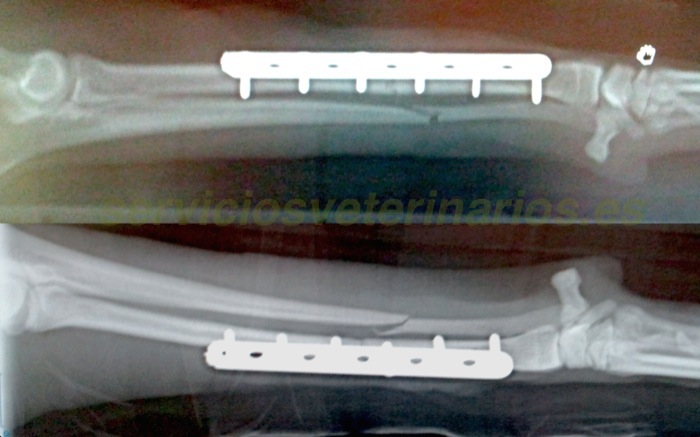 | Pruebas | Prequirúrgico correcto ( ECG, bioquímica 10 pruebas y hemograma) al igual que la placa de tórax. Radiografías bajo anestesia de ambos miembros anteriores. |