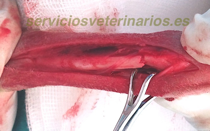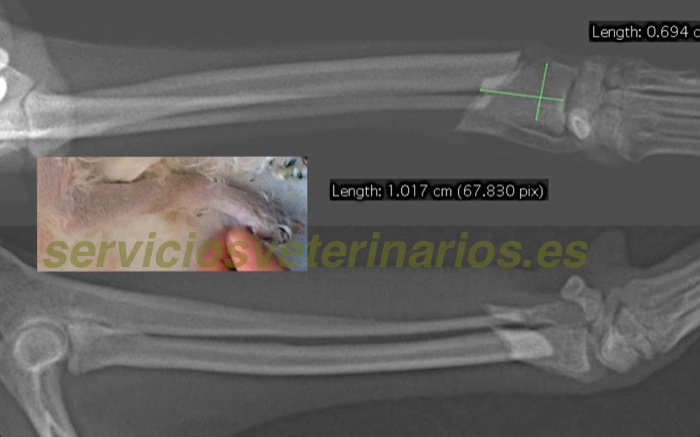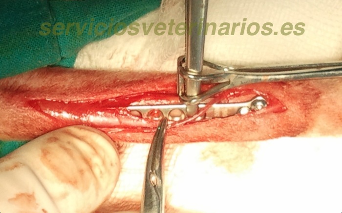 | Tratamiento | Inicialmente se le coloca un vendaje Robert-Jones hasta la cirugía que se realiza en las 24h siguientes. En esta tiempo no desarrolla inflamación en el foco de fractura ni hematoma. La intervención se lleva a cabo con una placa en T de 3 tornillos distales y 3 proximales de diámetro 1,5 mm. |