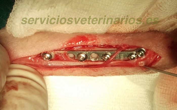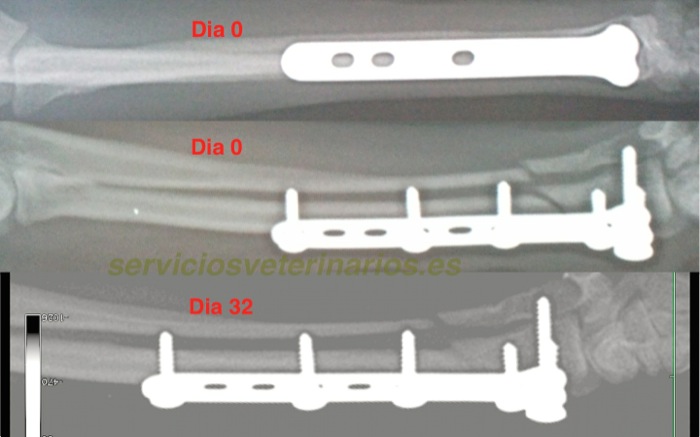 Para combatir el poco cayo óseo que generan estos animales se hará una eliminación parcial del implante en dos tiempos retirando primero los tres tornillos centrales. Quedará entonces y temporalmente con los tornillos más distales y esto origina una movilización o menor rigidez en el punto de fractura que estimula una osificación más potente al dinamizar el cayo óseo. Finalmente se retirarán tras varias semanas el resto de tornillos y placa. Si hace años se buscaba la mayor rigidez al utilizar material de osteosíntesis la tendencia actual es en estos casos llevar el cayo óseo a una “estabilidad dinámica”.