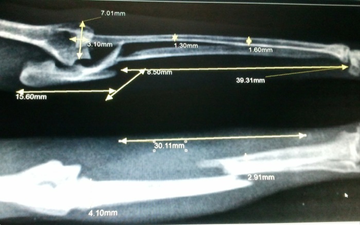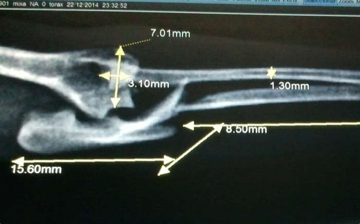 La fractura diafisaria media de radio del miembro derecho no presenta complicación aparente pero la lesión del miembro izquierdo con la fractura de Monteggia (fractura de cúbito con dislocación de cabeza de radio) no es sólo una lesión ósea.