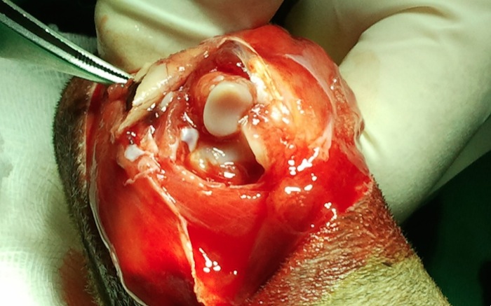 Estamos frente a una explosión del codo y esperábamos múltiples lesiones que no vemos en una placa: rotura de ligamentos, cápsula, tendones y músculos adyacentes y fisuras. Vemos la lesión de codo donde bajo piel y subcutáneo intactos encontramos un grupo de fragmentos y superficies articulares. Destaca en el margen superior el ligamento anular del radio.