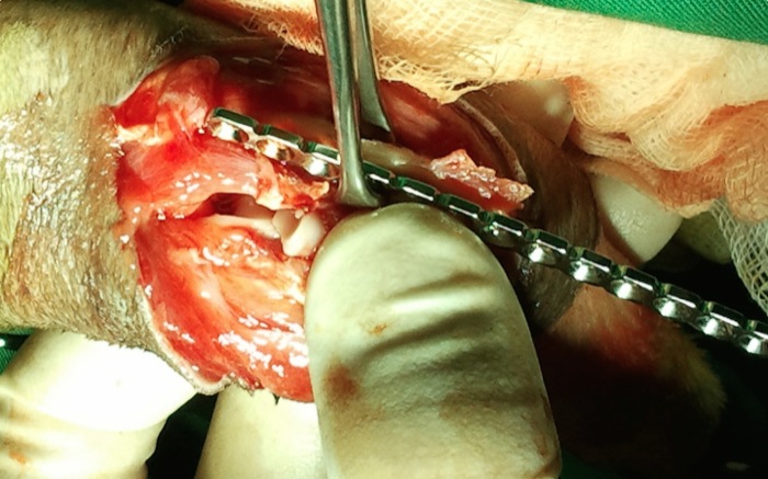 Empezamos reconstruyendo la articulación con manipulaciones precisas para no fragmentar ninguna de las partes. Se elige una placa de reconstrucción para adaptarse a cualquier pequeña curvatura del hueso.