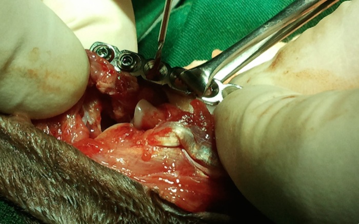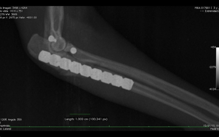 En este caso aplicamos tornillos de 1,5 mm que entran en lateral al cúbito. Con 2 tornillos, en cabeza de radio uno y otro en cóndilo humeral, y una sutura no absorbible (Premicrom® 2/0) tenemos una prótesis que mantendrá radio y húmero en posición fisiológica.
