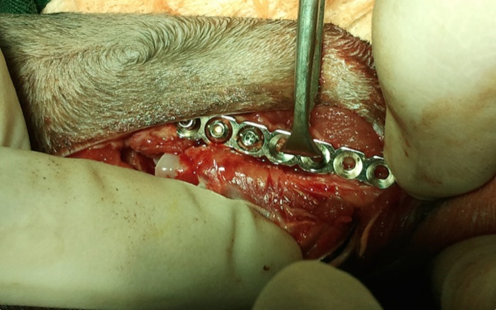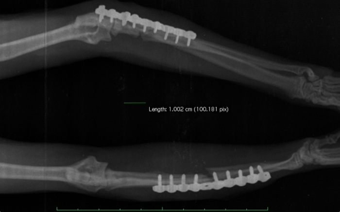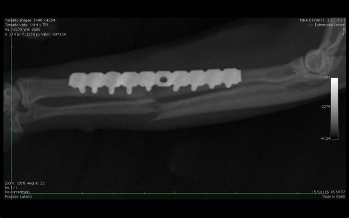 Ha durado mas de lo aconsejable la cirugía, 2h y 45 min. pero el resultado es estable con 2 corticales firmes por tornillo. La evolución a partir de aquí va a depender de un manejo estricto del entorno del paciente felino.
