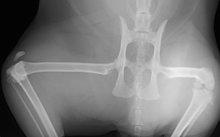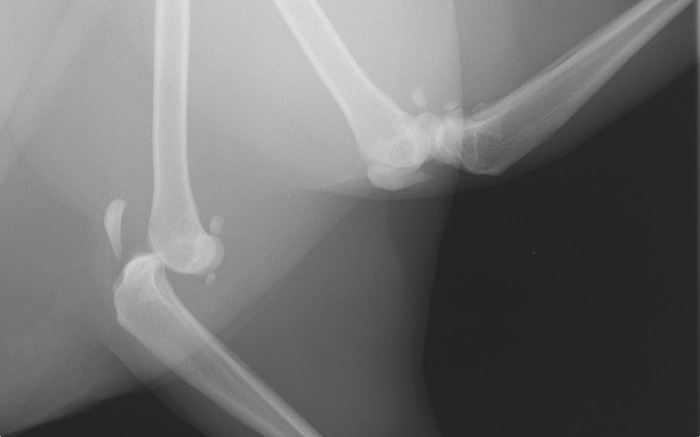 | Pruebas | La radiografía expone una amplia luxación femoro-tibial sin fracturas aunque con una gran inflamación de rodilla. La cápsula parece íntegra. El ligamento cruzado caudal está roto pero el craneal no es valorable. Obviamente en este caso hay grandes limitaciones para la exploración incluso bajo anestesia. |