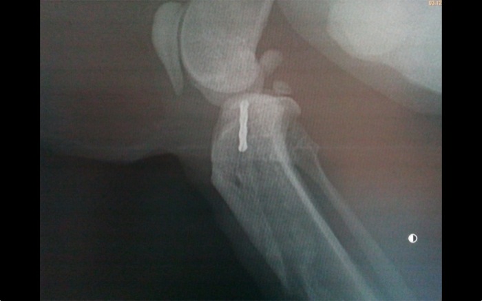 El animal se mantuvo dentro de casa y se limitó en lo posible su movilidad sobre todo en alturas pero aparece al mes y medio de la intervención con este desplazamiento. Aunque la inmovilización de la rodilla se pensó para dos meses se decide liberar la articulación y valorar. Algunos autores recomiendan esperar entre 6 y 8 semanas.