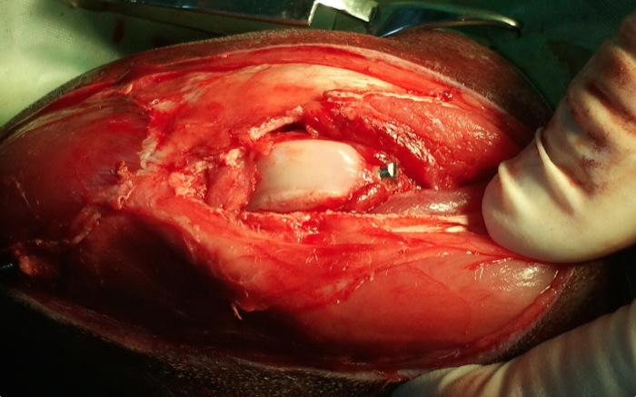 | Tratamiento | No estamos ante un caso frecuente y se ve como la mejor alternativa la estabilización articular temporal ante un daño tan extenso. Este procedimiento se complementa con una cirugía extracapsular para la reparación del ligamento cruzado craneal. La limpieza intrarticular y retirada de restos de tejido dañado deberá contribuir a minimizar una futura artrosis. |
