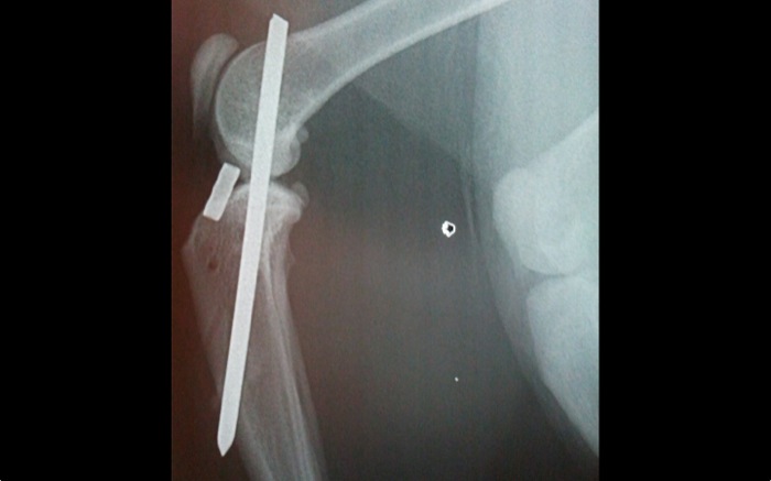 En quirófano tras retirar el clavo tenemos una rodilla con movilidad disminuida en la flexión-extensión pero estable ante cualquier movilidad lateral o de rotación. La evolución no ha presentado complicaciones y ya en la revisión a las 48 h tenemos una buena evolución con un gato que se desplaza en consulta con igual destreza en ambos miembros posteriores.