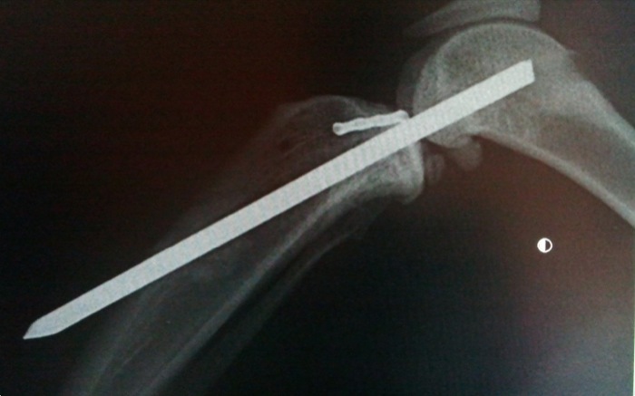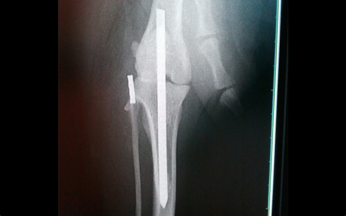 La artrodesis o anclaje articular temporal queda en la posición esperada en un segundo intento. Se realizó previamente una prueba con una aguja de Kirshner de pequeño calibre pero la dirección de salida no era idónea. Sí en un nuevo intento saliendo distal y por el centro de la cresta tibial.