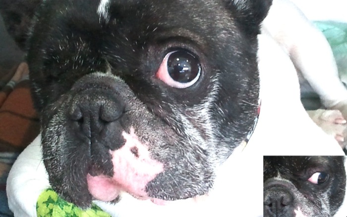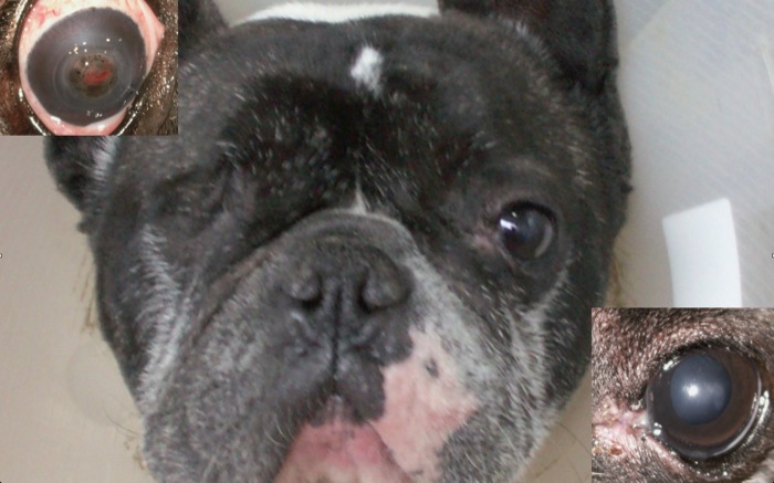 | Historial | Perra Bulldog Francés de 7 años con un largo historial de problemas oculares que hace 5 meses acabaron en la enucleación del ojo derecho tras la perforación en la última úlcera que le aparece. Se recomendó en este momento prevenir quirúrgicamente los más que probables problemas futuros. En diciembre de 2014 se trata con plasma autólogo y diversos colirios de nuevo otra úlcera en el ojo restante. |