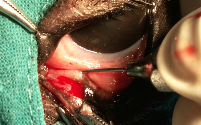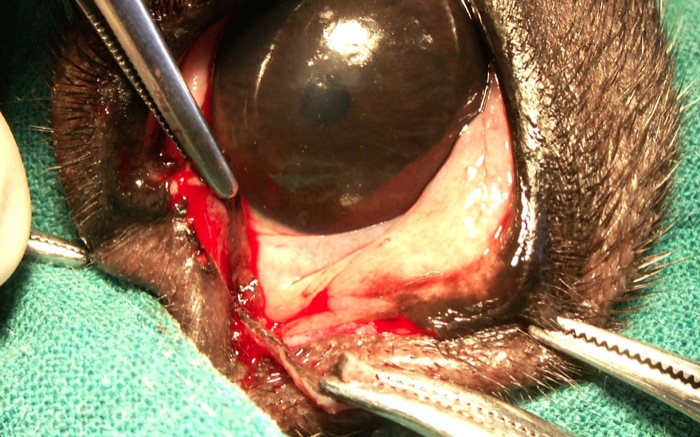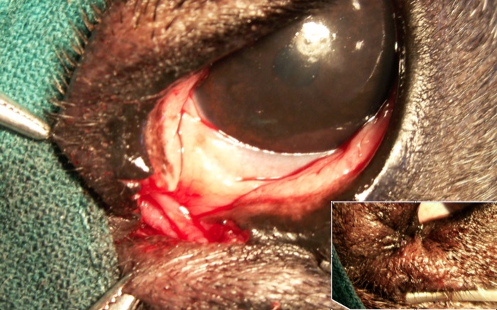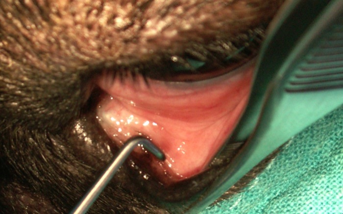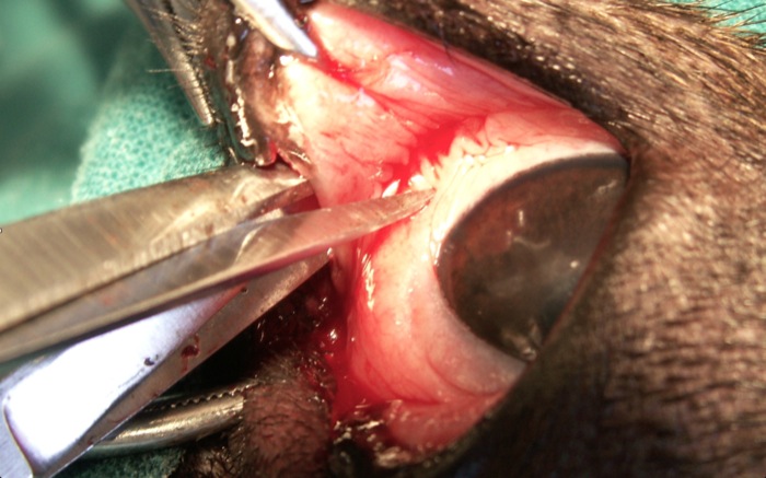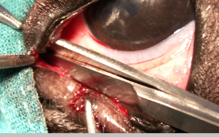 La conjuntiva se rota desde dorsal al bolsillo ventral y se sutura con un punto exteriorizado hasta un tubo de silicona que mantiene la tracción. Una vez creada una nueva carúncula pasamos a suturar los párpados. Empezamos por el punto que une ambos bordes palpebrales seccionados y vamos hacia medial.
